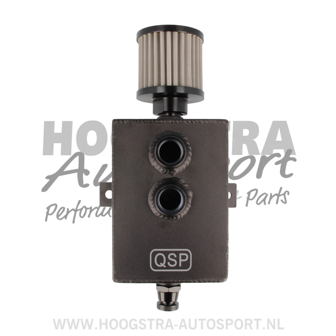 Aluminium olie catch tank 2 liter, voorzien van een inwendig schot, ook wel “baffled” genoemd. Deze carterontluchting tank is voorzien van een aftapkraan, wat het aflopen van de olie erg eenvoudig maakt