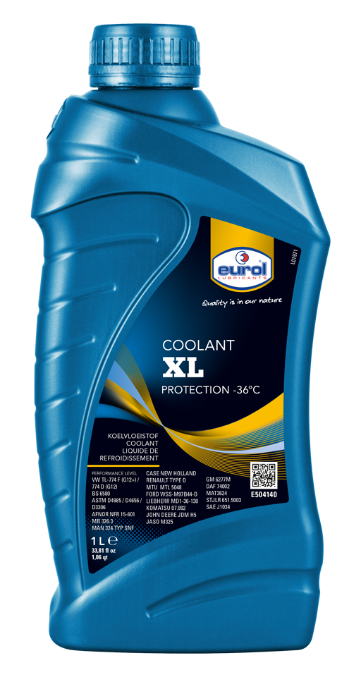'Long-life' coolant, based on ethylene glycol and organic corrosion inhibitors.Since Eurol Coolant XL -36°C meets the performance level of a broad set of specifications, it can be used in a wide variety of vehicles.... XL is free of nitrite, amine, borate, phosphate and silicate, contributing to a cleaner environment. Lifetime of this product is 5 years or 650,000 km for trucks and 250,000 km for passenger cars.