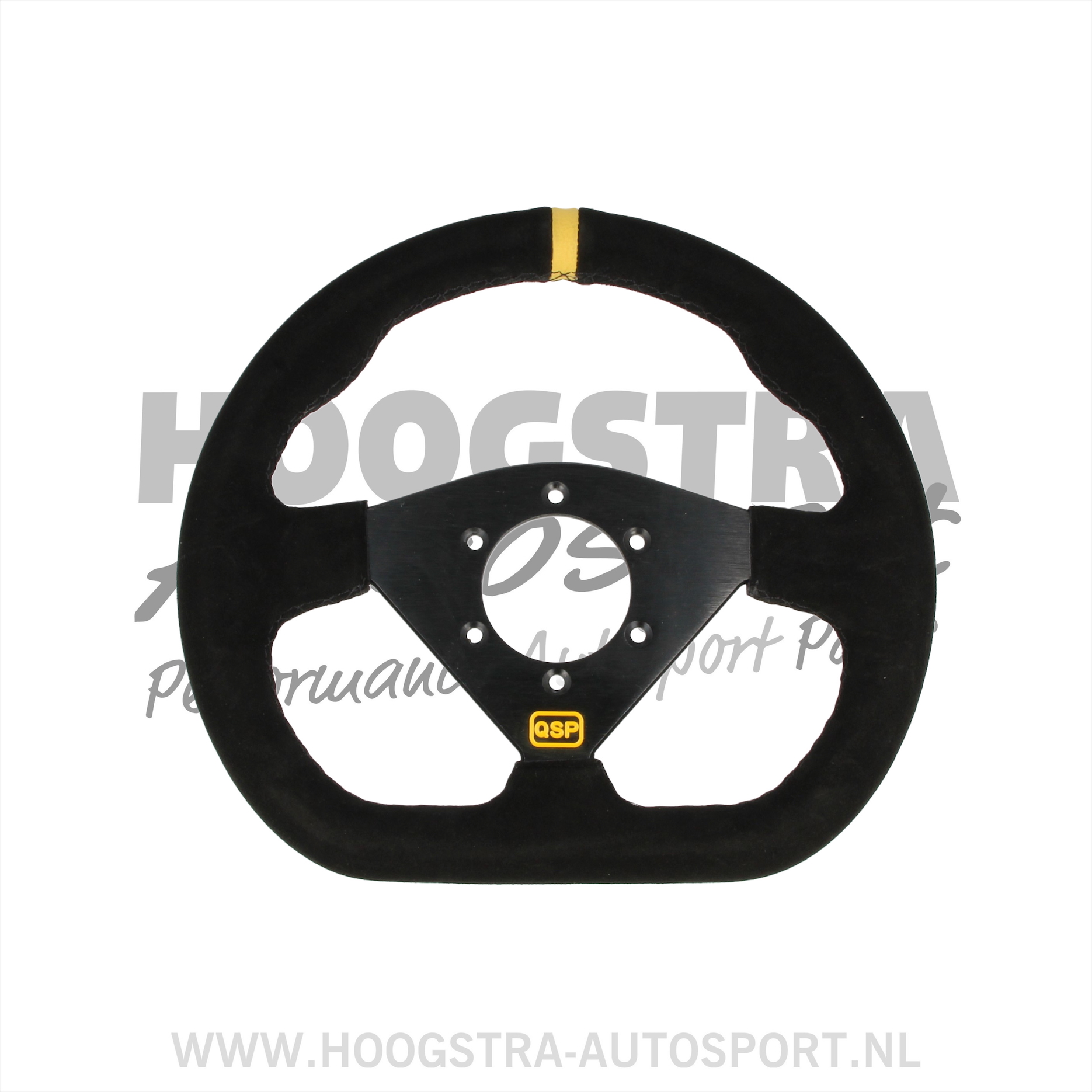 Formule style suède sportstuur van QSP Products. Een formule style stuur wordt vaak toegepast in formule auto’s, single seaters en race simulatoren. Dit Formule style model sportstuur van QSP Products heeft een diameter van 285 mm en is aan de onderzijde voorzien van een afvlakking. De totale hoogte van het stuur is van de bovenste ronding tot aan de onderzijde 260 mm. Het Formule style sportstuur is vlak uitgevoerd met 3 zwart geanodiseerde aluminium spaken. Dit sportstuur wordt compleet geleverd inclusief claxon en stuurring.