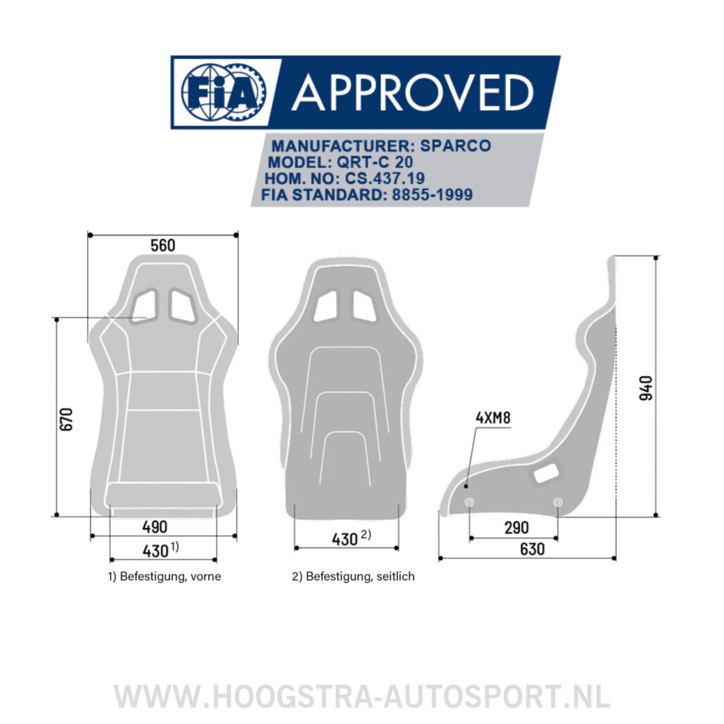 De gebruikte bekleding is bijzonder slijtvast en door de dunne polstering kan een lage zitpositie worden gerealiseerd. De stoel is vervaardigd met QRT (Quick Resin Technology): een door Sparco ontwikkeld en gepatenteerd snelle-harsproductieproces waarmee het gewicht van de kuip tot een absoluut minimum wordt gereduceerd, zonder in te leveren op stevigheid en veiligheid.