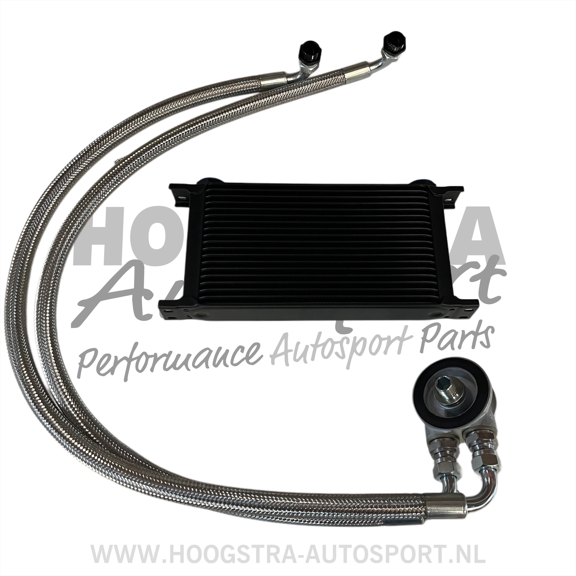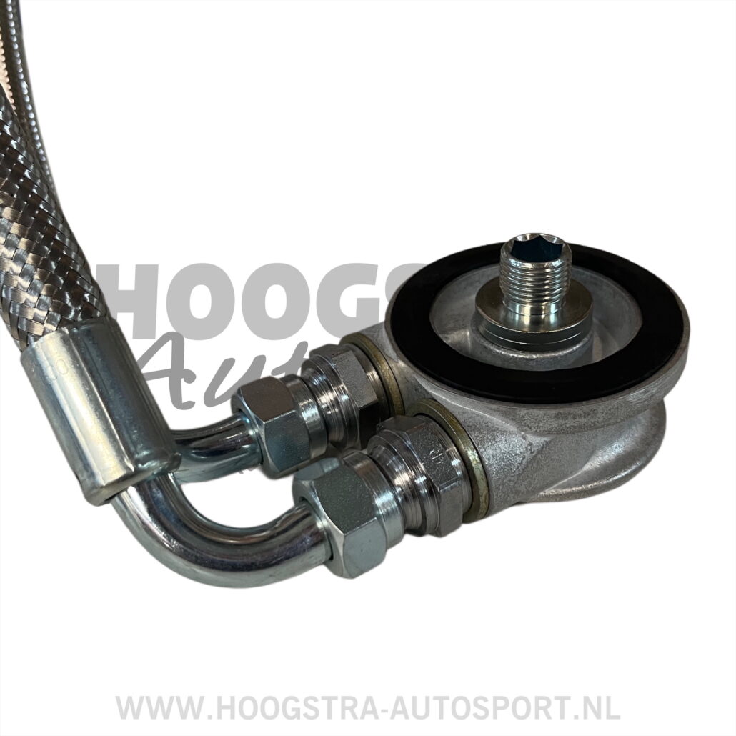 Complete set met slangen en houder voor de oliekoeler slangen hebben een 90 graden bocht met aansluiting 1/2 duims voor olie koeler en onder zijde adapterplaat