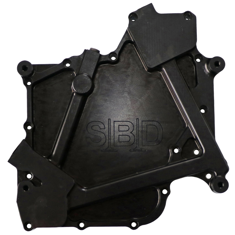 Des canaux sont fraisés dans la partie principale du carter, ce qui permet au système de carter sec de collecter l'huile à la fois à l'avant et à l'arrière du carter, de sorte qu'aucune conduite externe n'est nécessaire. Le carter est ensuite scellé par une fine plaque supérieure, qui est fixée au corps principal du carter. Il suffit de prévoir une alimentation à partir de votre réservoir à carter sec et un retour vers le réservoir (via un refroidisseur d'huile si nécessaire).