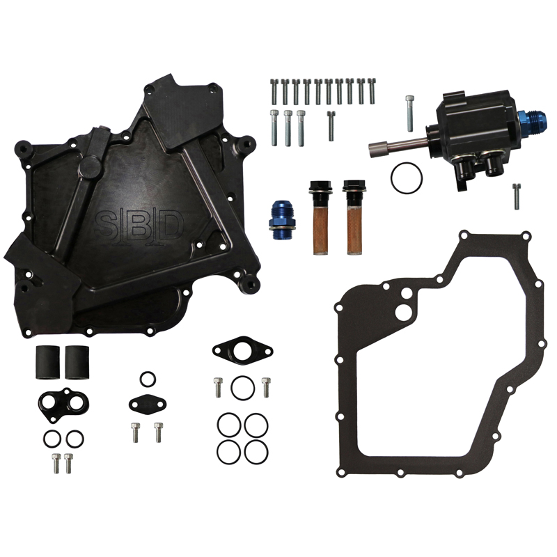 amovible La pompe à huile à carter à deux étages, qui remplace la pompe à eau d'origine (vous avez besoin d'une pompe électrique), est conçue de manière à pouvoir être retirée et montée pendant que le carter est en place, ce qui permet à l'utilisateur d'inspecter de nombreux composants sans avoir à retirer le carter ou à démonter le moteur plus avant. La pompe se monte directement sur notre carter à sec sans avoir besoin de tuyaux.