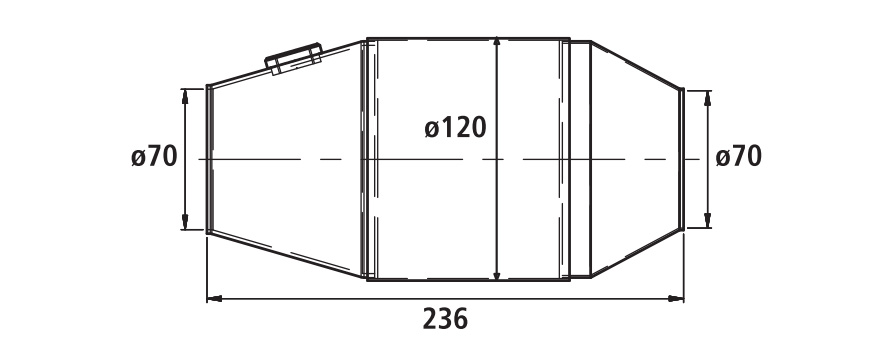 Dimensions : 120 dia, 236 mm long, 70 mm ansl.