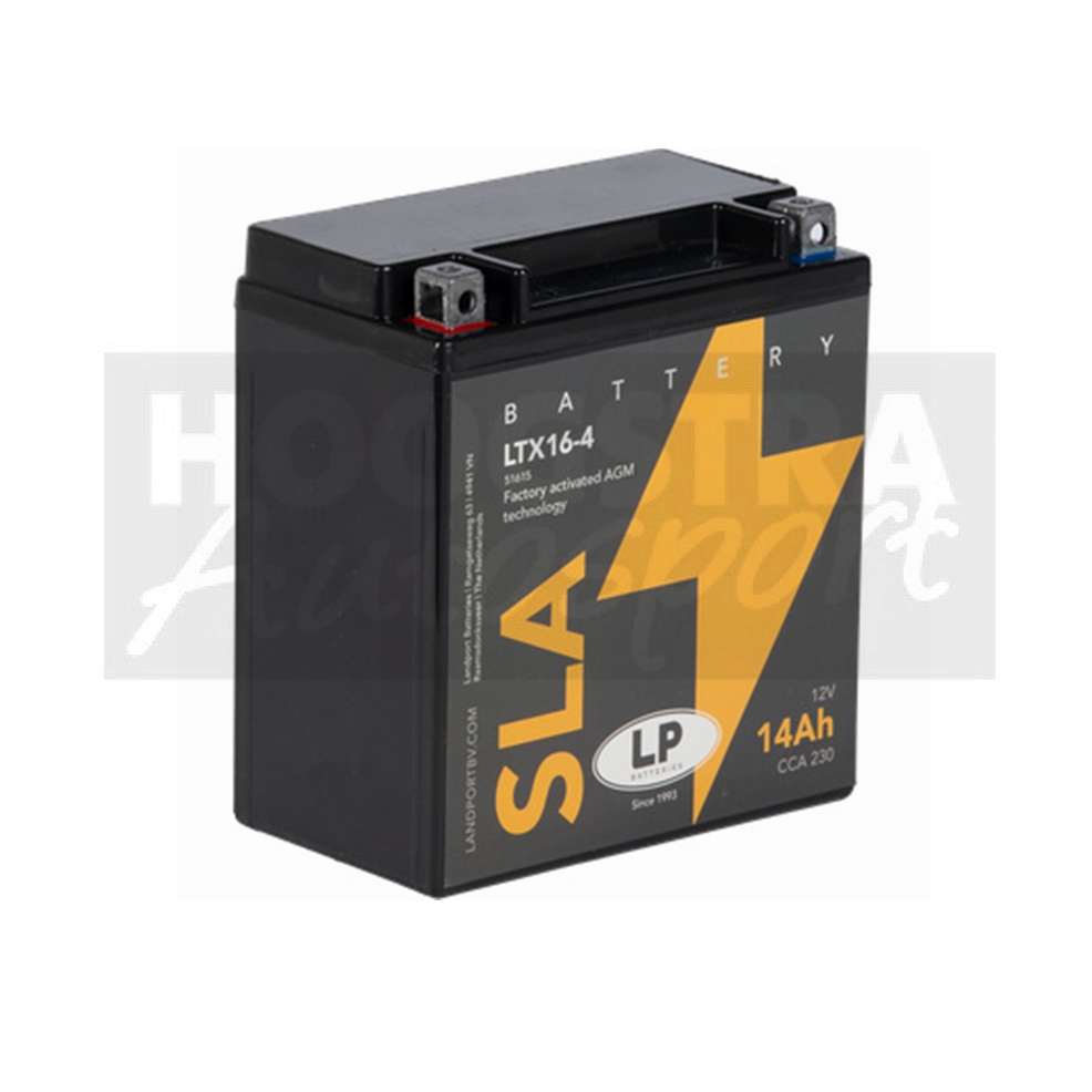 Cette batterie moteur SLA LTX16-4 (51615 - anciennement LP YTX16-4) 12 volts 14,0 Ah CCA30 de la marque Landport (LP) est une batterie moteur très fiable, sans entretien et sans fuite. La batterie moteur SLA LTX16-4 est 100% sans fuite, remplie, chargée et scellée en usine, donc sans entretien et vous n'avez jamais besoin de la recharger. La batterie a une capacité de démarrage à froid de 230 CCA. Les dimensions sont les suivantes : 150 mm de long, 87 mm de large et 163 mm de haut.